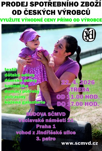 dovolujeme si Vás pozvat na Jarní prodejní akci SČMVD, která se uskuteční ve středu 22.4.2026 od 11 do 17 hodin ve 3. patře budovy SČMVD ve velké zasedací místnosti (vchod z Jindřišské ulice na rohu Václavského náměstí)